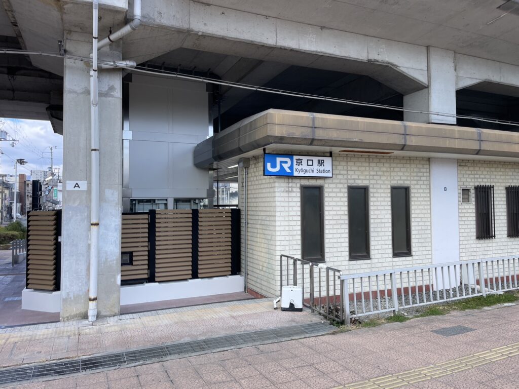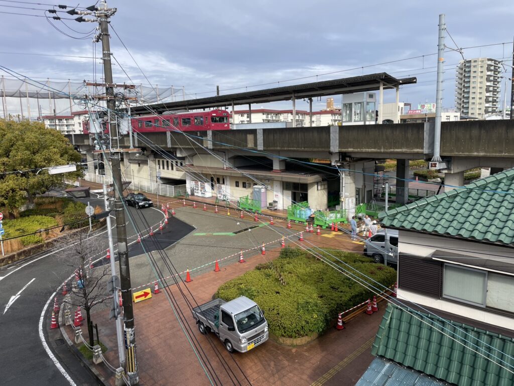 駅のホームの向こう側に見える赤い屋根の団地が「京口第二団地」です。